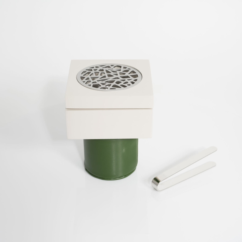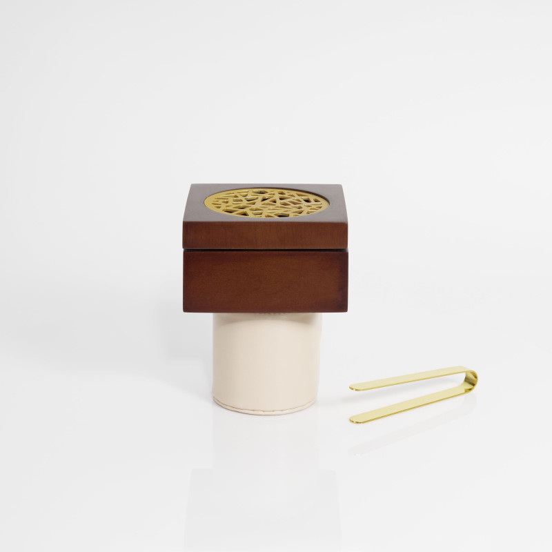 بخر خشبي مصنوع من خشب الجوز الطبيعي عبارة عن قاعده اسطوانية الشكل عليهاغطاء من الجلد يعتليها مكعب مربع مع ديكور للقاعده العلويه مصنوع من الالمنيوم